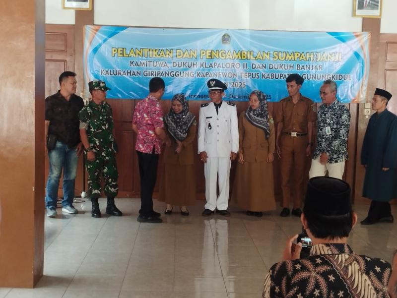 Giripanggung (18-12-2025) Pemerintah Kalurahan Giripanggung kembali menyelenggarakan acara penting dengan pelantikan dan pengambilan sumpah/janji Kamituwa, Dukuh Klapaloro II, dan Dukuh Banjar. Acara ini dilaksanakan pada hari Kamis, 18 Desember 2025, bertempat di Balai Kalurahan Giripanggung, dan dihadiri oleh berbagai pihak penting dari wilayah sekitar.