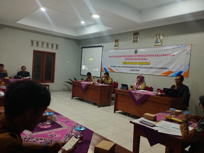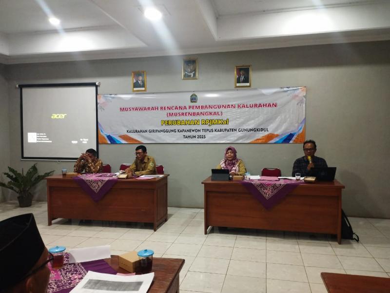 Giripanggung (29/12/2025) Pemerintah Kalurahan Giripanggung menggelar Musyawarah Perencanaan Pembangunan Kalurahan (Musrenbangkal) Perubahan RPJMKal di Balai Kalurahan Giripanggung pada hari ini, Senin, 29 Desember 2025. Kegiatan ini bertujuan untuk melakukan penyesuaian dan penyempurnaan Rencana Pembangunan Jangka Menengah Kalurahan (RPJMKal) agar tetap relevan dengan kondisi serta kebutuhan masyarakat terkini.