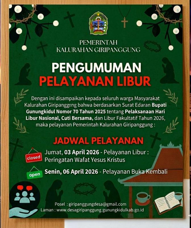 Dengan ini disampaikan kepada seluruh warga Masyarakat Kalurahan Giripanggung bahwa berdasarkan Surat Edaran Bupati Gunungkidul Nomor 70 Tahun 2025 tentang Pelaksanaan Hari Libur Nasional, Cuti Bersama, dan Libur Fakultatif Tahun 2026, maka pelayanan Pemerintah Kalurahan Giripanggung libur pada:
