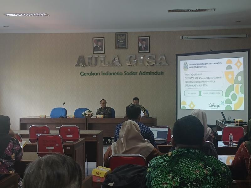 Gunungkidul (23/04/2026) Pemerintah Kalurahan Giripanggung turut menghadiri rapat koordinasi evaluasi perjanjian kerja terkait implementasi aplikasi Smart Dukcapil serta persiapan penilaian administrasi kependudukan Tahun Anggaran 2026. Kegiatan ini diselenggarakan oleh Dinas Kependudukan dan Pencatatan Sipil (Dukcapil) Kabupaten Gunungkidul pada Kamis, 23 April 2026, bertempat di Ruang GISA Dukcapil Gunungkidul.